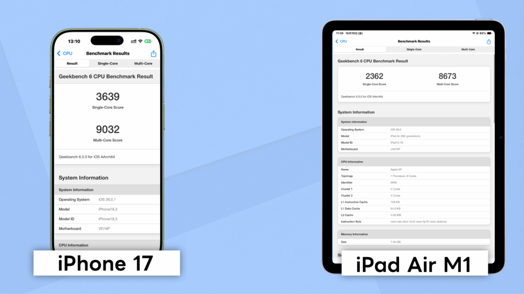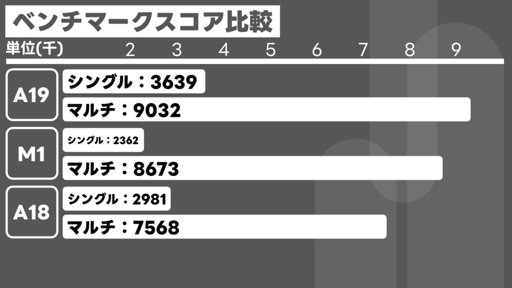 まさかの”A19チップ”が”M1チップ“をシングルスコア・マルチスコアともに上回る結果となりました….