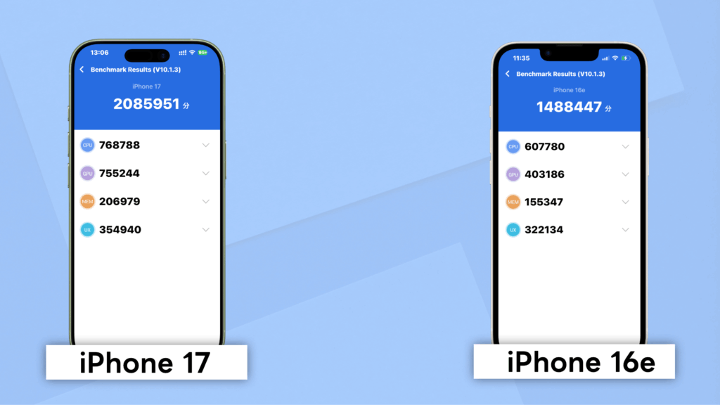 A19搭載iPhone 17が”2085951“点 A18搭載iPhone 16eが”1488447“点という結果になりました。