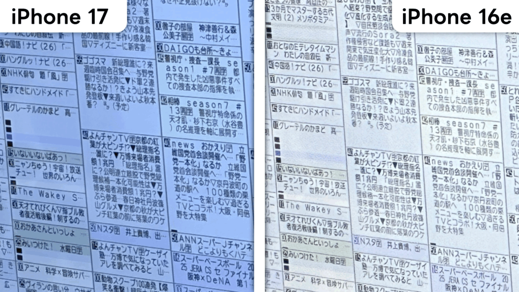 iPhone 16eで撮影した画像を確認すると、番組表の文字がすべてAIが生成したように歪んでおり、非常に読みづらくなってしまっています。