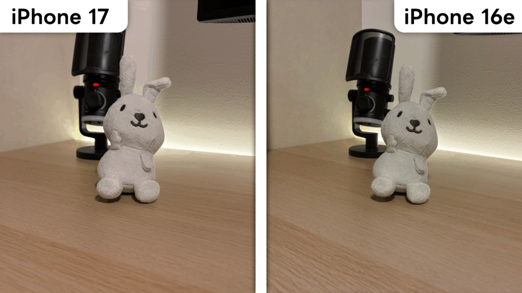 被写体(ラッピー)の顔の左側を見ると、iPhone 17とiPhone 16eの間で明確な差が出ているのが分かります。