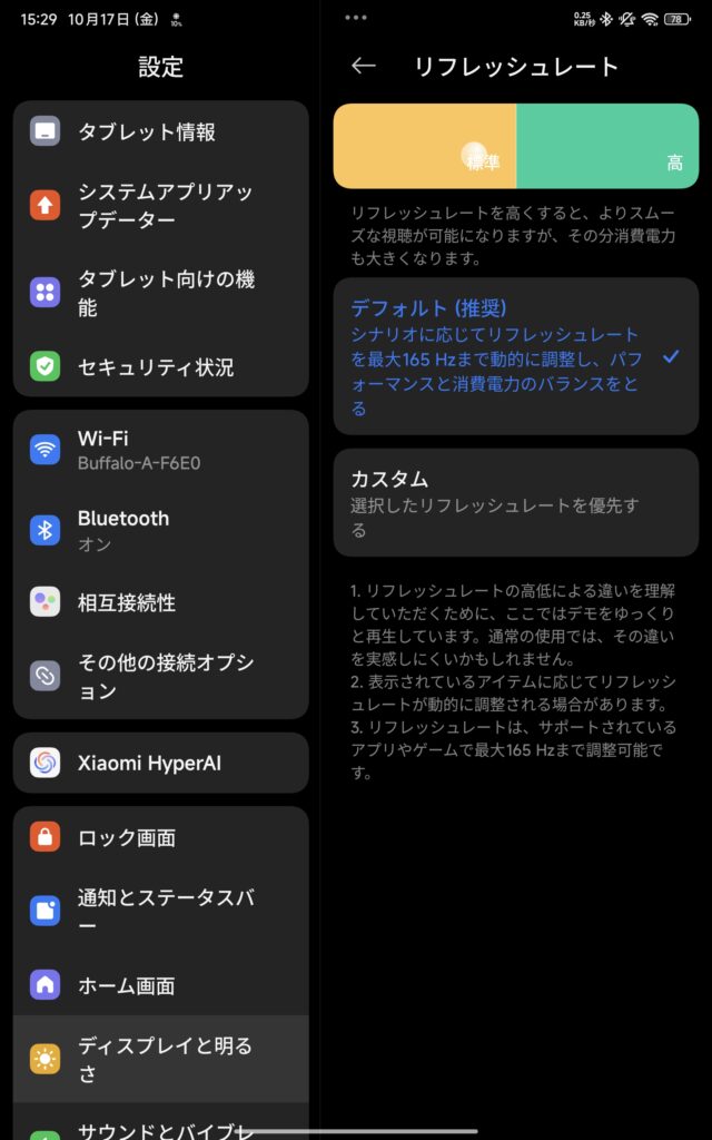 165hz対応の画面はやっぱり綺麗。正直、そこまでhz数は必要かと思っていたが、実際に使ってみるとヌルヌル動くのでホーム画面を触るのが楽しい。一応画面の設定で推奨設定がデフォルトになっており、場面ごとにhz数が変化しているはずなので、常に165hzというわけではないが、逆にその方がバッテリー持ちが良くなるのでありがたい。