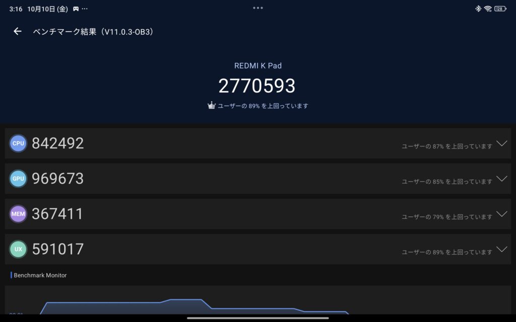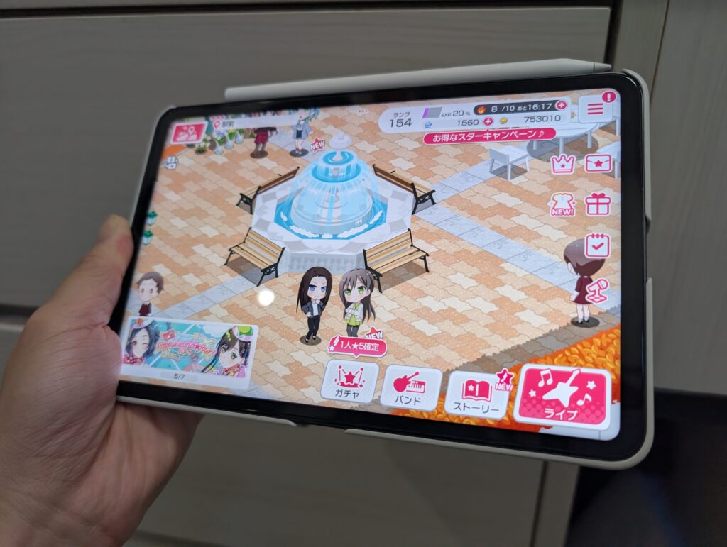 バンドリは、8.5周年ということでスマホゲーとしてはかなり前から存在するゲームだが、このゲームに3Dライブなるものが存在していて、このモードが重い。普段使ってるPixel 9 Proだとカクカクしてしまうことがあったり、音がズレるという音ゲーでは許されないことが多々あったが、そんなこともなく Xiaomi Pad Miniはしっかりと動作してくれている。快適。
