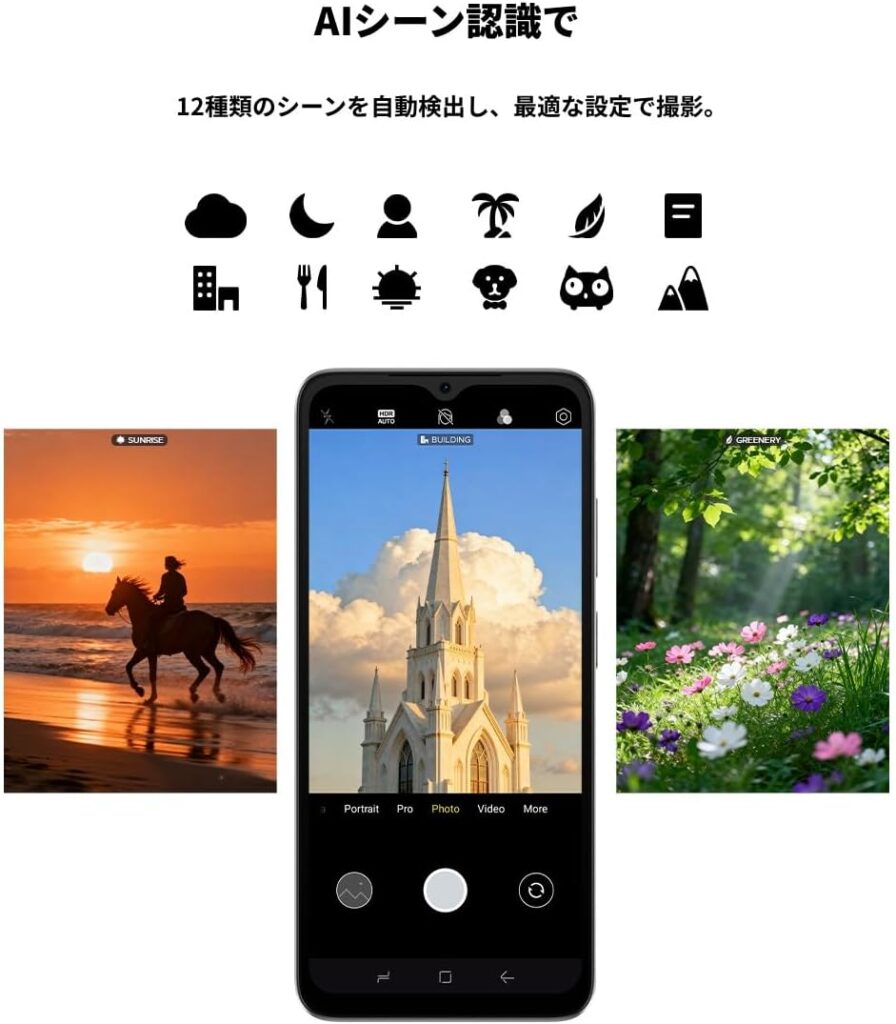 スペックだけ見れば非常に控えめですが、DOOGEE独自のAI画像処理でこれを補います。HDR、ナイトモード、美顔補正といった多彩なモードを搭載し、日常のスナップやSNS投稿、オンライン会議には十分な画質を提供します。