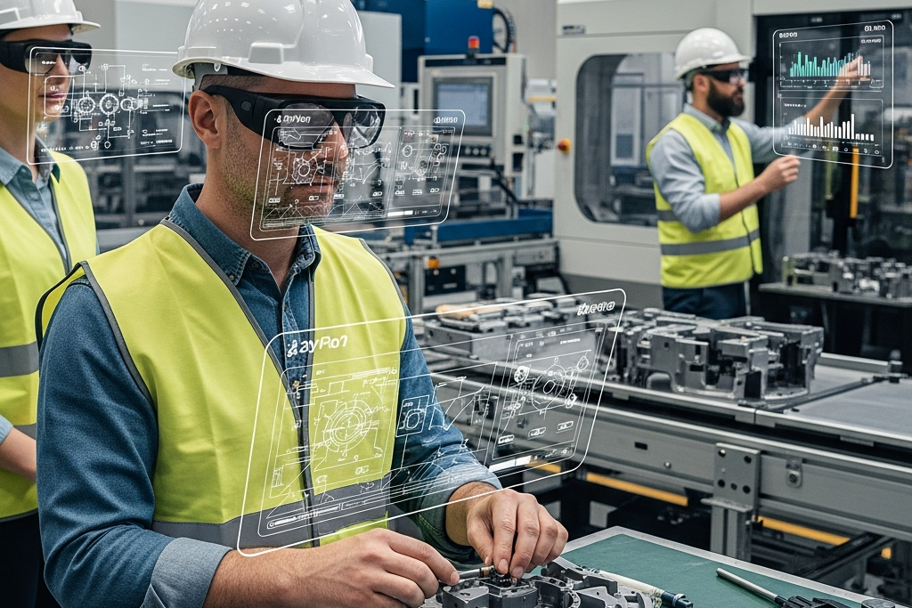 製造業の現場で、作業マニュアルを視界に表示させながら両手で作業する。