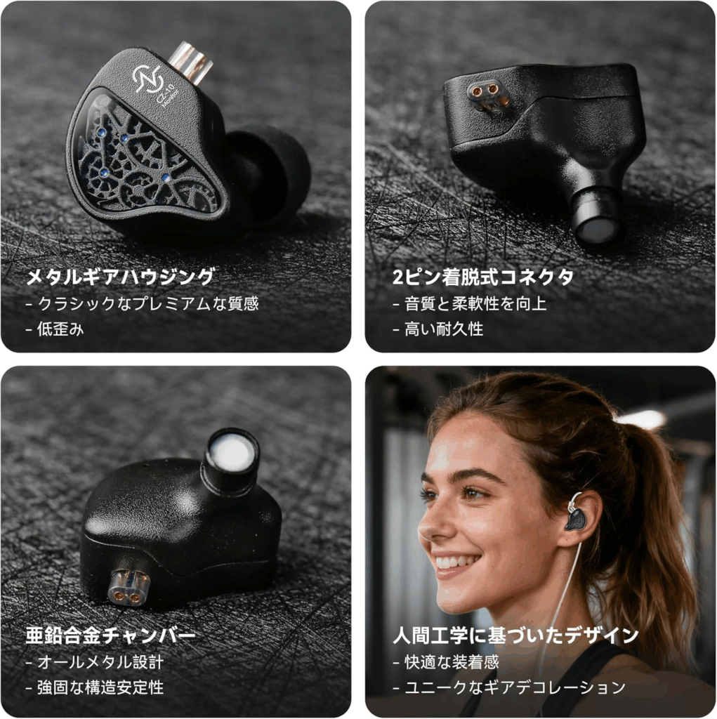 CCZ CZ10 天工輪のデザインは、様々なデザインのイヤホンが登場している2025年の昨今でも非常に個性的なギアデザイン、メカニカル調のデザインを採用しています。プラ?アクリル?ガラス?かはちょっとわかりませんでしたが、フェイスプレートに空いた小窓から歯車デザインが見えるようになっており、筐体素材には、軽量なアルミではなく、比重が高く剛性に優れた亜鉛合金を採用しています。 手に持った瞬間に伝わるずしりとした質量感と、金属特有の冷ややかな触感。(冬にはヒヤッとしますが…w)この物理的な重さが、不要な共振を徹底的に抑制し、分析的な寒色サウンドを生み出している要因の一つといえるでしょう。一方で、片耳でも10gを超える重量のため、イヤーピースとの相性によっては装着感に難を覚える方もいらっしゃるように感じました。ベント孔に関しては、表には空いておらず、内側に2つ空いているのみで音漏れはほとんどありませんでした。
