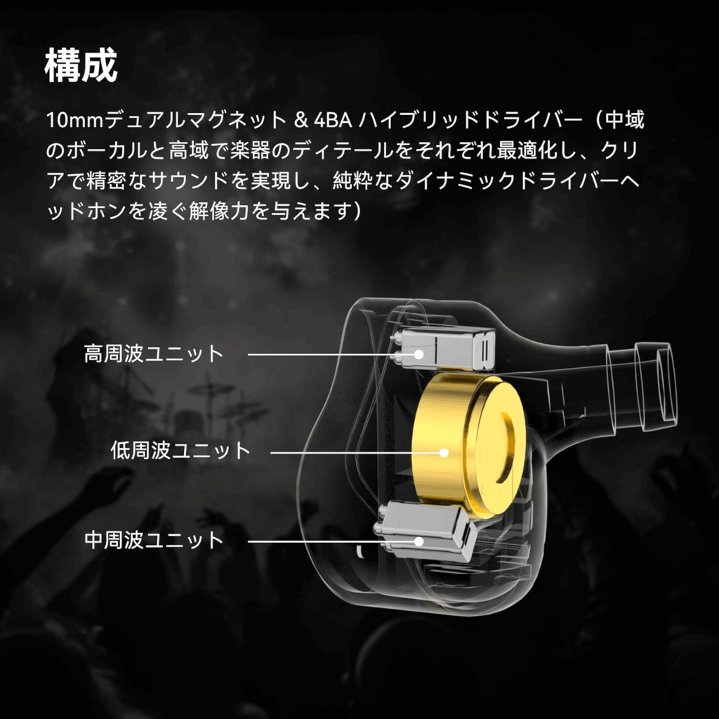 それでは、実際に聴いてみた音質のレビューです。 本機はPET振動板の10mm二重磁気ダイナミックドライバーに加え、中音域用と高域用に分かれた4基のBA(バランスドアーマチュア)を搭載したハイブリッド構成となっています。