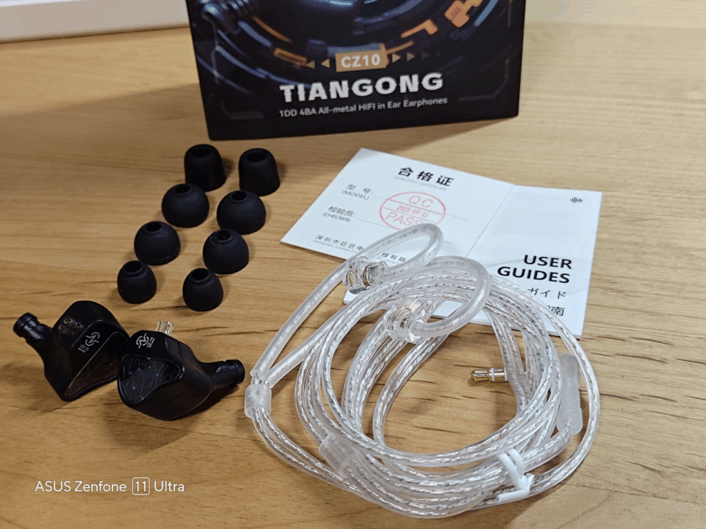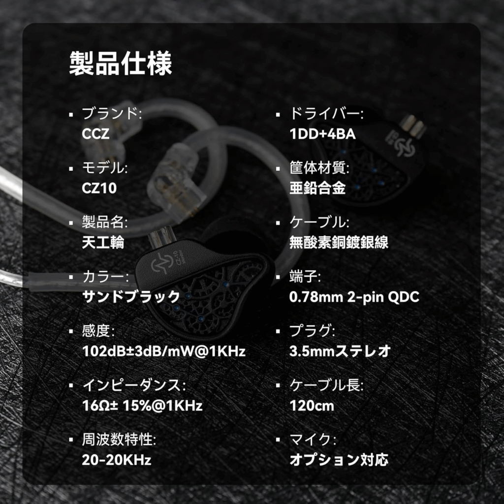 CCZ CZ10 天工輪のドライバー構成は1DD+4BAとなっており、1DD構成の多かった近年のCCZとしてはかなり珍しい多ドライバーハイブリッドイヤホンになっています。ドライバーの詳細についてはDDに10mm 二重磁気PET振動版ダイナミックドライバーを採用しており、ここは、CCZがメジャーに採用しているドライバーと同様のものが採用されているようです。