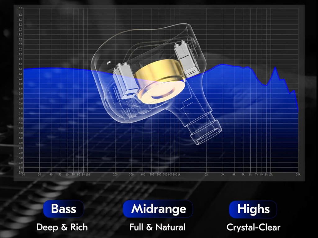 ミッドベース(中低音)を中心に、2重磁気振動版の深みのある低音域を感じます。20Hz〜100Hzあたりが低域のピークで物理的な量感は十分ですが、ボワつきや余計な膨らみが一切なく、パンチ力がありながらも極めてタイトに締まった低音域に仕上がっています。スピード感が非常に速いため、高速なバスドラムもつぶれずに鳴らし切ります。