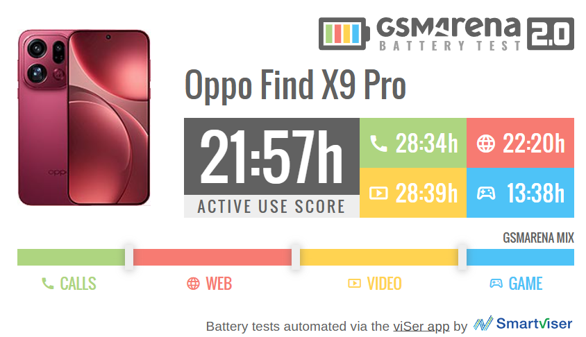 OPPO Find X9 Proのバッテリーには、前作を大きく上回る超大容量の7500mAhバッテリーを搭載しています。 最新のシリコンカーボン(Si/C)技術により、薄型のボディを維持しながらも、スマホ業界で最大級の容量を実現しました。大手レビューサイトであるGSMArena氏による実測のバッテリーテストでは、Active Use Scoreで21時間57分と、前作のFind X8 Pro(15時間18分)やGalaxy S25 Ultra(14時間49分)を圧倒するスコアを叩き出しています。