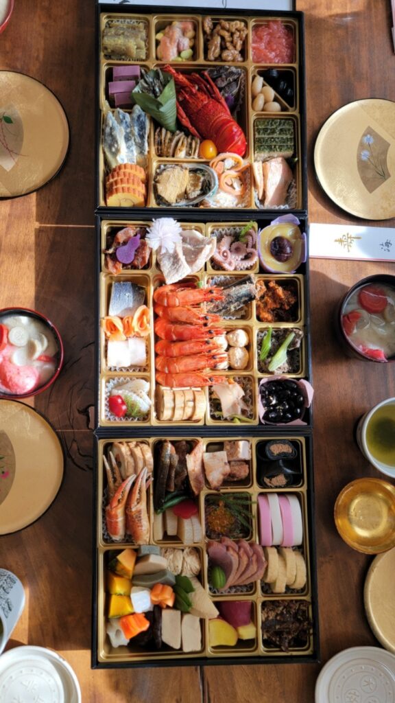 よったんおせち料理にのっている食べ物でエビと伊勢海老とカニのハサミが突然生き返って動き出して、机の上に逃げていく
