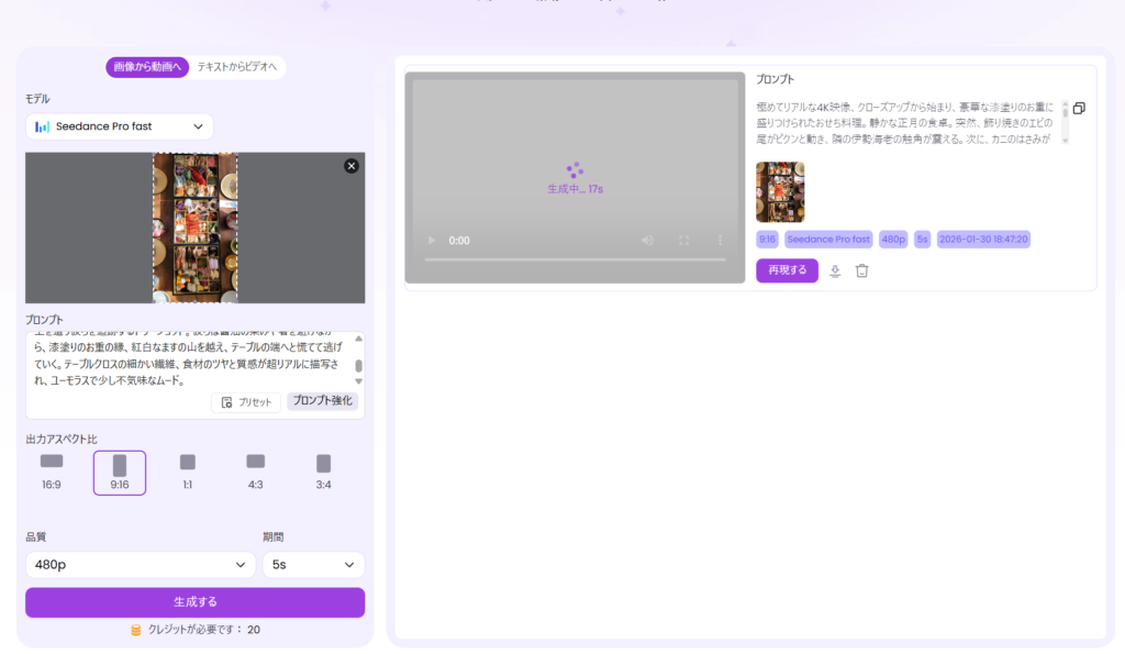 最初からSora 2を使うのは、宝くじを引くようなものです。プロンプトが意図通りに動くかどうかの確認(アングル、被写体の雰囲気など)は、消費クレジットの少ないSeedance Pro (20cr) や Kling Standard (38cr) で行いましょう。 - ここぞという時だけSora 2