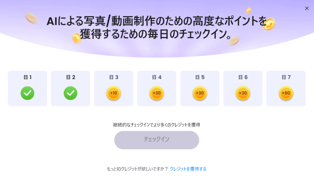 EaseMate AIを無料で使い続けるための生命線が、この機能です。 ウェブサイト、またはアプリに毎日ログインし、「Check-in」ボタンを押すことでクレジットが付与されます 。