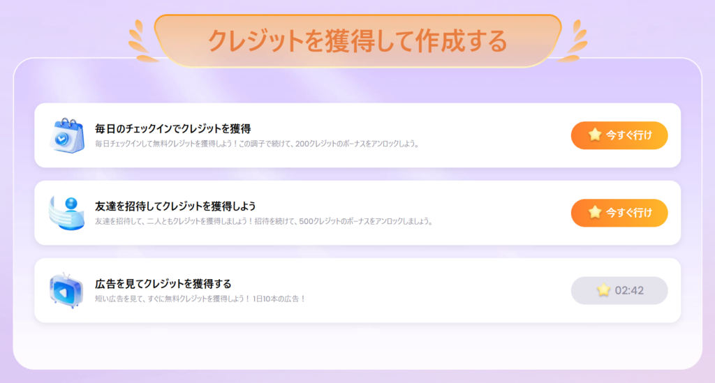 友人や知人を招待し、彼らが登録を行うと、双方にクレジットが付与されます。 SNS等で拡散力のあるユーザーであれば、これで大量のクレジットを稼ぐことも理論上は可能です。