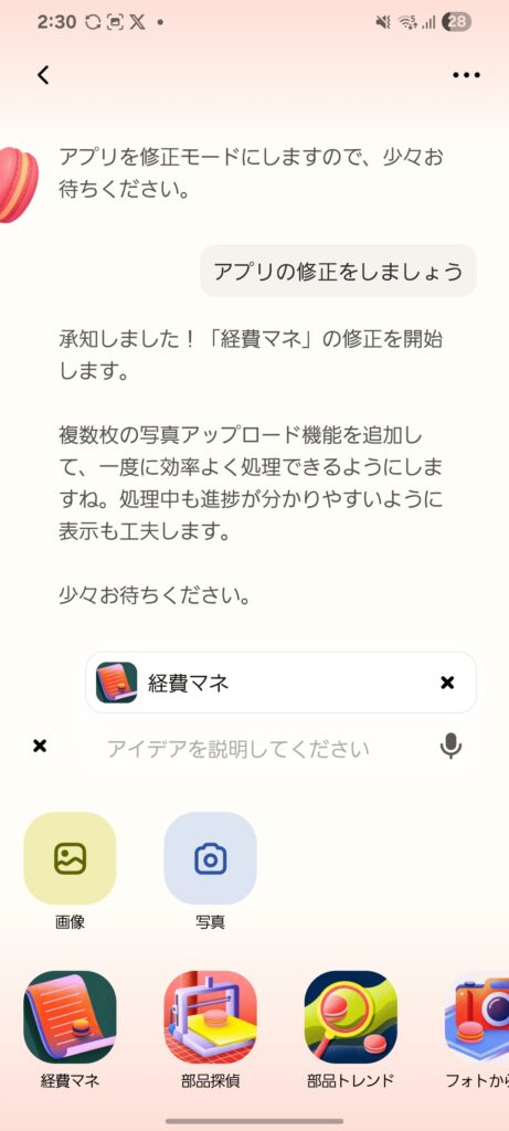アプリの修正にも10アーモンド使用してしまうので、まずは上のようにチャットでアプリを選択せずに会話をして修正案をまとめたうえで、アプリをメンションして修正を開始してもらうのがコツです!(メンションしてなくてもアプリについての会話は可能です)