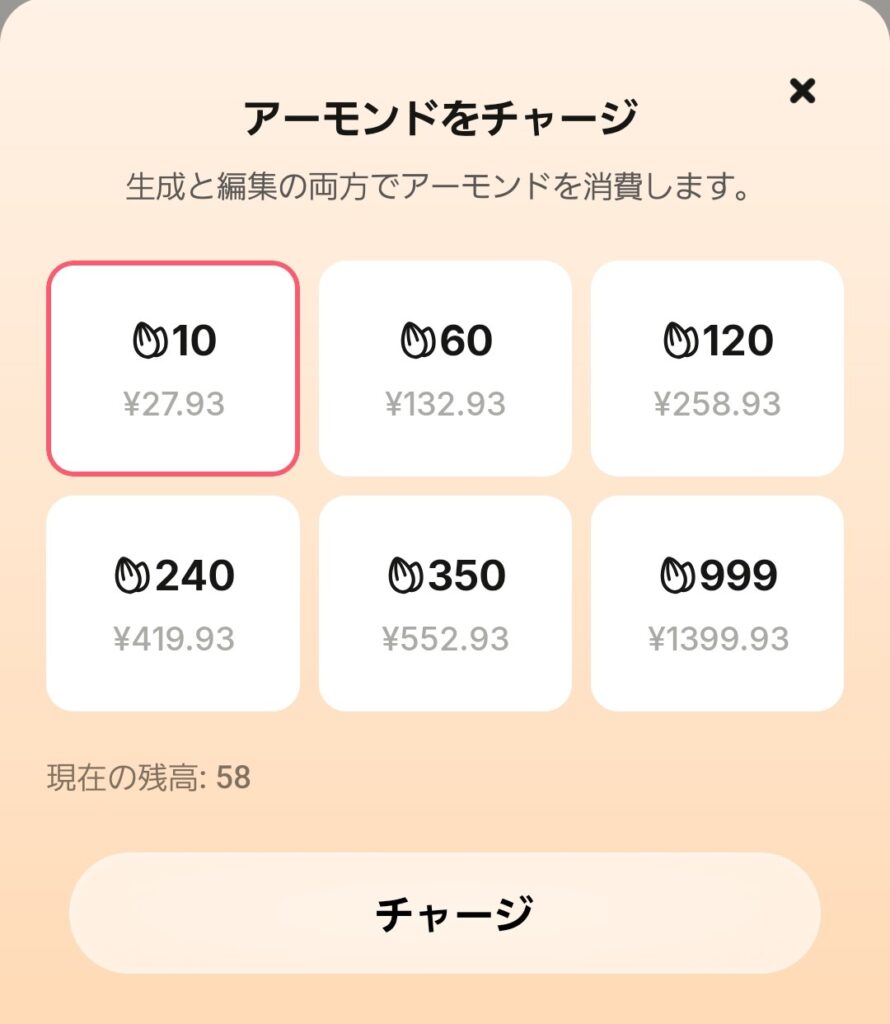 50アーモンド分は無料で使えるので、まずは試してみましょう!