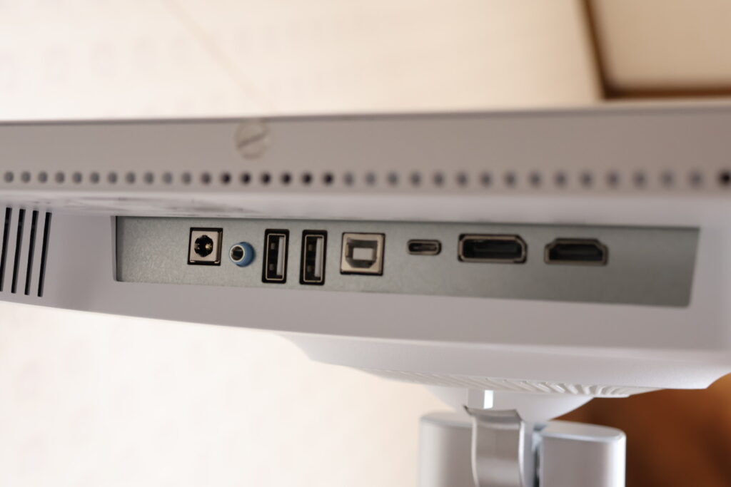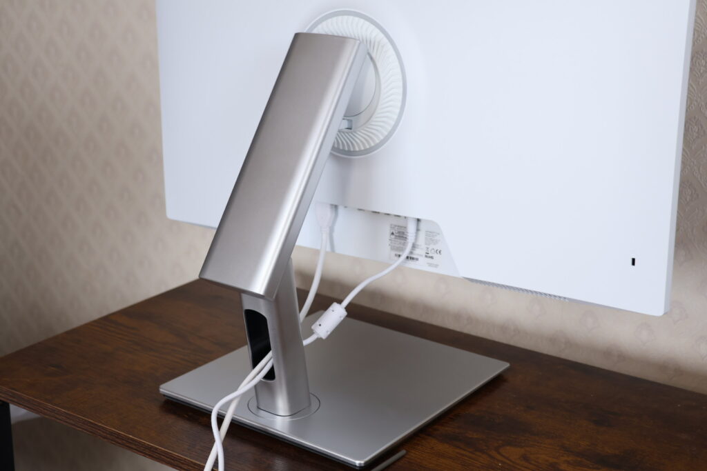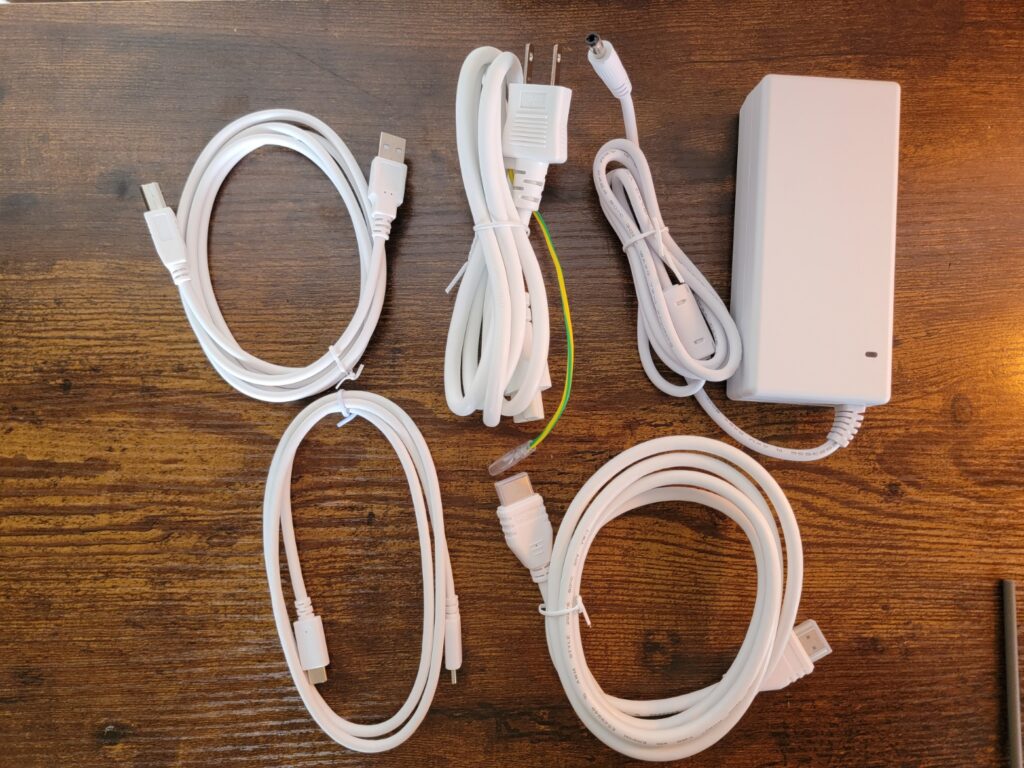 付属品を見るとわかります。目を引くのは、その徹底した「白」へのこだわり。モニターの背面やベゼルが白いのはもちろんですが、HDMIやUSB Type-Cのケーブル、さらにはデスクの上で意外と存在感を放ってしまう電源アダプターまで、すべてがクリーンなホワイトで統一されているんです。